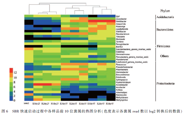 4 組實驗的微生物群落結構熱圖和主成分分析是基于各樣品中含量前10 位菌屬共計34 種菌屬(如圖6 和7 所示)。根據主成分分析的聚類結果,可以將R1 和R2 的啟動分為3 個階段,這與反應器運行的狀況相吻合。階段(1 ~ 15 d),反應器中活性污泥還處于適應期,進水為普通生活污水,主要以變形菌門中,如不動桿菌屬(Acinetobacter)、布蘭漢氏菌屬(Alkanindiges)、嗜門菌屬(Methylophius)和生絲微菌屬(Hyphomicroblum)等占優勢;第二階段(15 ~ 25 d),開始以高鹽廢水為進水,此時鹽度的沖擊負荷使得微生物群落結構反生改變,變形菌門中的微生物豐度進一步增加,并達到較大豐度;第三階段(25 ~ 45 d),經過一段時間的運行和馴化,擬桿菌門中,如鳥桿菌屬(Gelidibacter)、黃桿菌屬(Flavobacterium)、碳酸噬胞菌屬(Aequorivita)等逐漸成為優勢種屬,而變形菌門中的微生物豐度下降。有趣的是,由于復合菌劑和菌填料的投加,第二階段芽孢桿菌屬(Bacillus) 的豐度上升,并在之后的運行中逐漸成為優勢種屬,而這一階段R1 與R2 對TOC 的去除率也遠高于R3,因此,復合菌劑的投加對改善生物工藝有機物去除效果,縮短啟動時間具有顯著的效果。